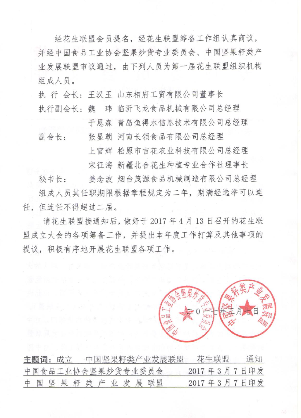 出席本次大會的嘉賓有本協會從事和花生產業相關業務的企業,各省、市、縣堅果炒貨協會(商會)及相關部門代表。本次大會內容安排流程:1.協會、聯盟介紹,花生聯盟入會要求及標準;2.中國花生產業現狀概述(種子原料、產地種植、農資、加工及市場等);3.花生深加工及工藝技術;4.花生機械的應用;5.添加劑香精香料在花生食品中的應用;6.花生加工市場前景預測分析及推廣宣傳;7.參觀花生聯盟秘書長單位,會議承辦單位煙臺茂源食品機械制造有限公司,現場技術指導。