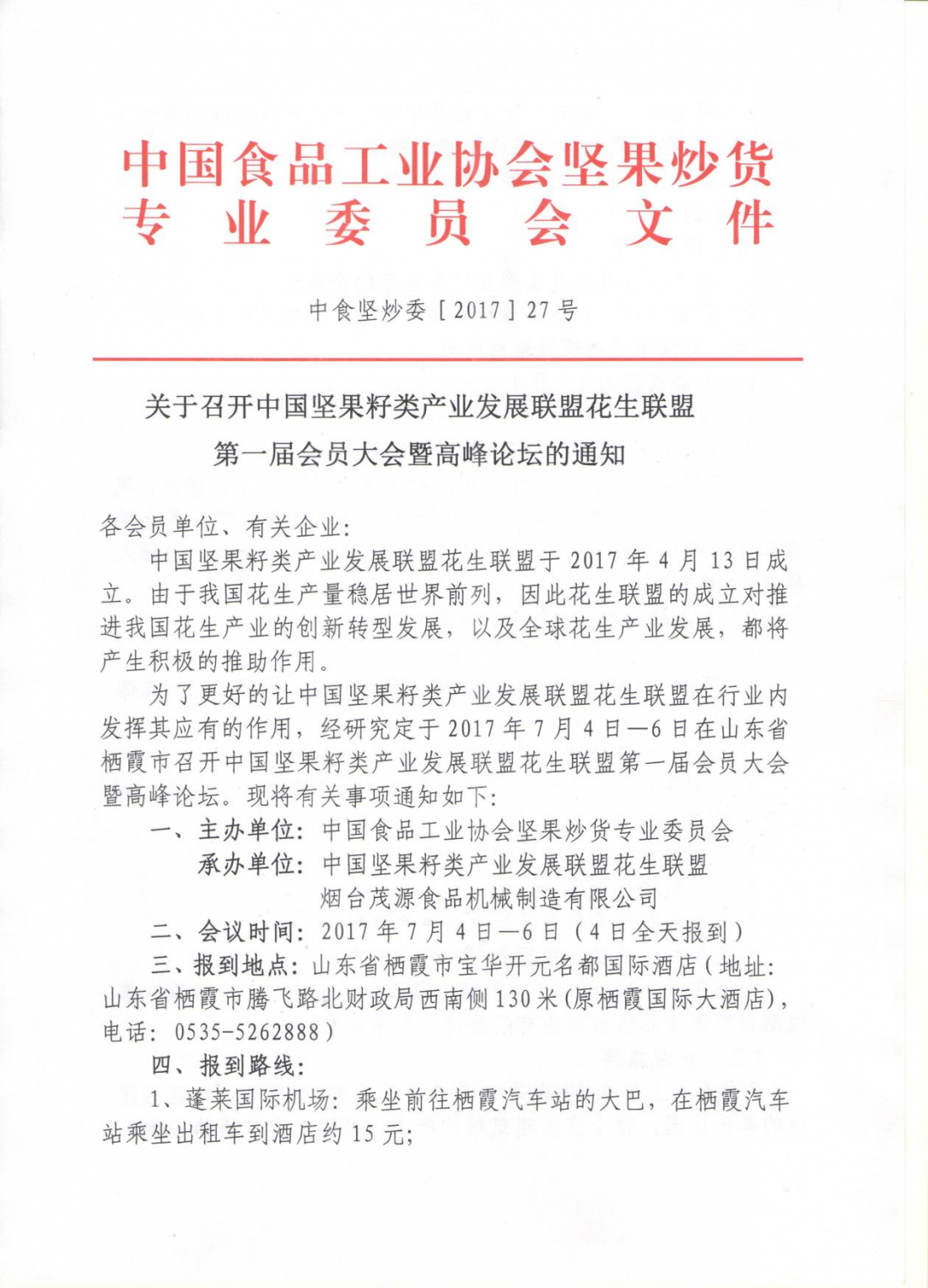 2017年7月4日—6日,由中國食品工業協會堅果炒貨委員會主辦,中國堅果籽類產業發展聯盟花生聯盟和煙臺茂源食品機械制造有限公司共同承辦的中國堅果籽類產業發展聯盟花生聯盟頭一屆會員大會暨高峰論壇在山東省棲霞市召開。