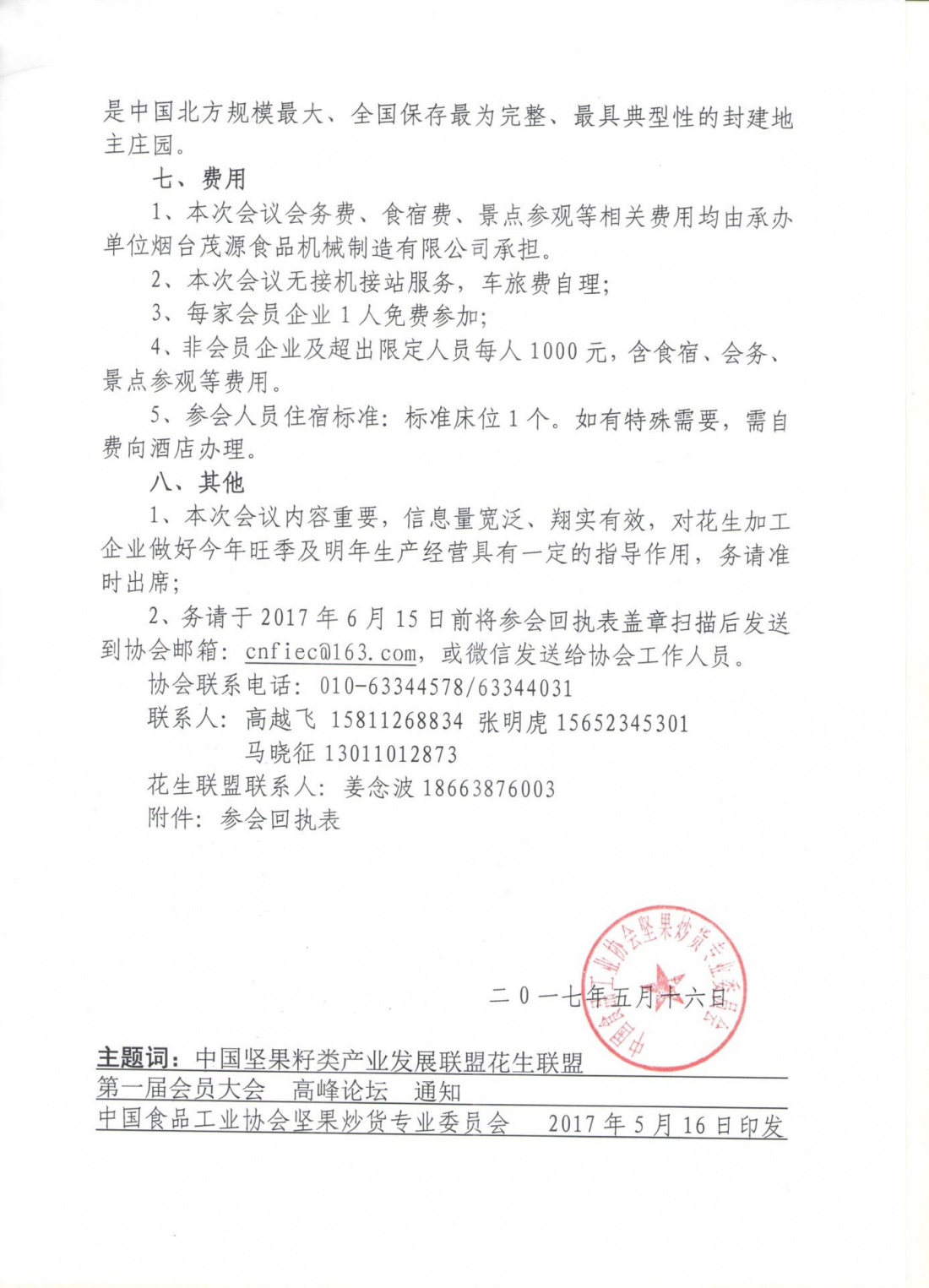 1、請各參會代表務必將回執表的每一項填寫齊全,于2017年6月15日前,蓋章掃描后發送到郵箱:cnfiec@163.com,或微信發送給工作人員,以便做好各項準備工作; 2、協會電話:010-63344578/63344031 聯系人:高越飛 15811268834馬曉征13011012873 花生聯盟聯系人:姜念波18663876003 郵箱:myspjx@163.com |